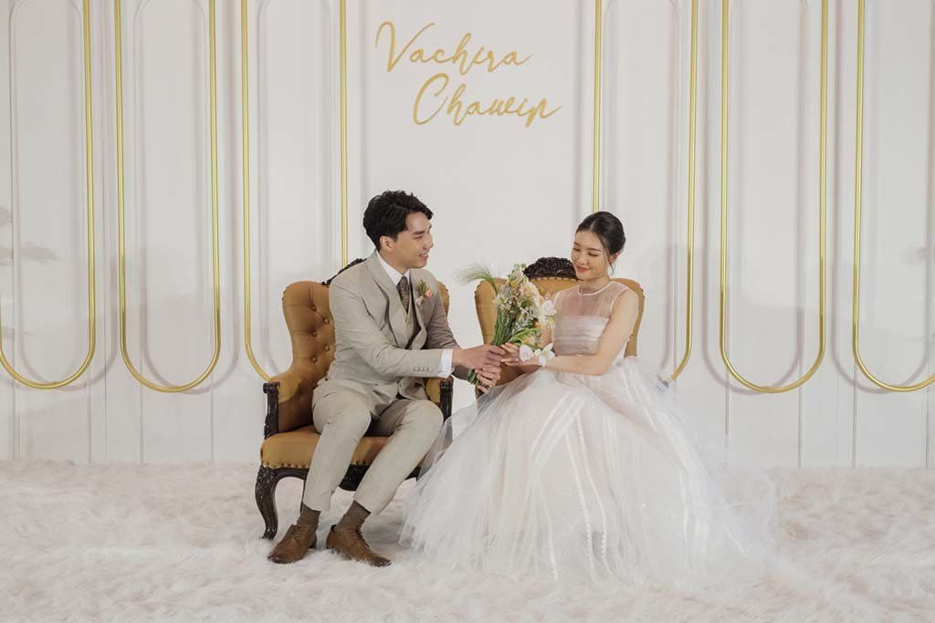 - ป้ายชื่อบ่าว-สาวและชุดโซฟาบนเวที