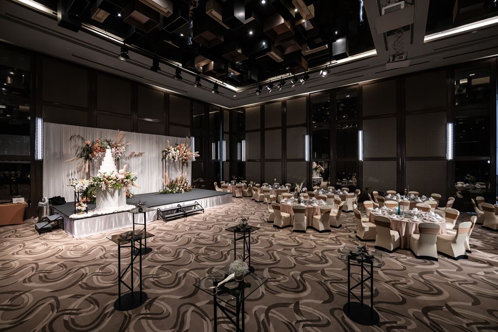 - ที่นั่งจัดเรียงอย่างพิถีพิถันในห้องจัดเลี้ยงอันมีสไตล์