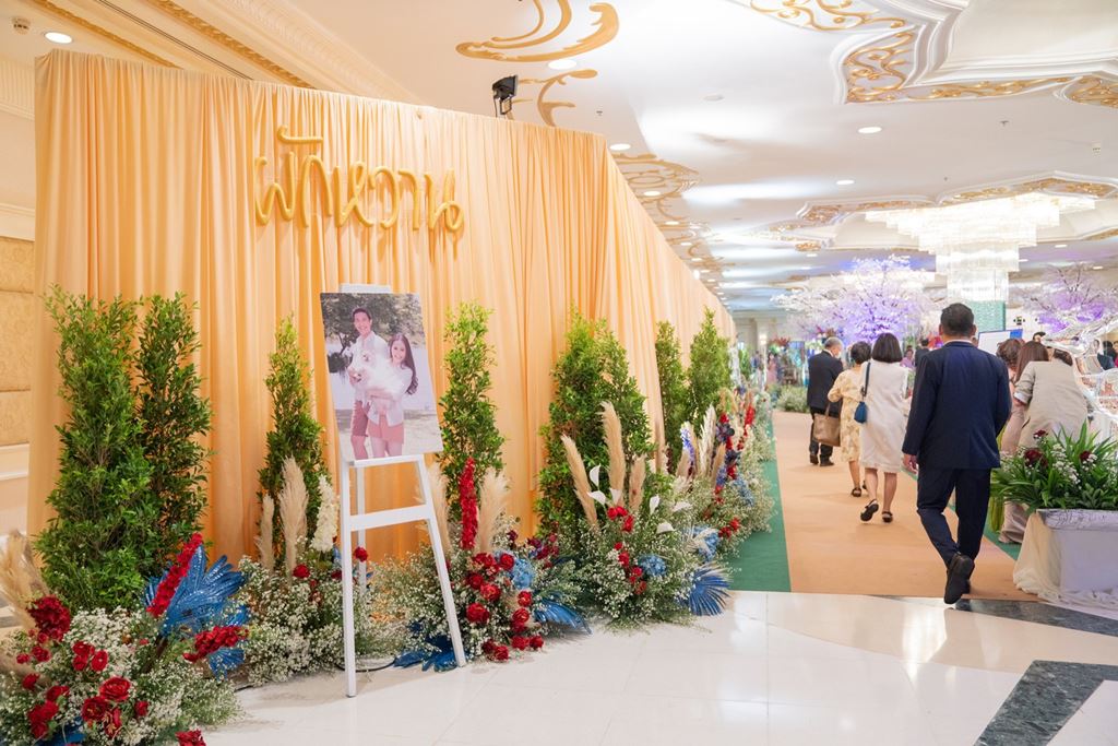 - ซุ้มดอกไม้ประดับหน้างาน พร้อมอักษรย่อ