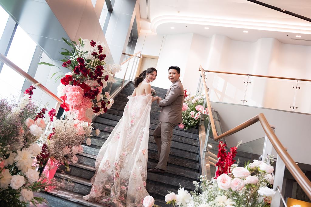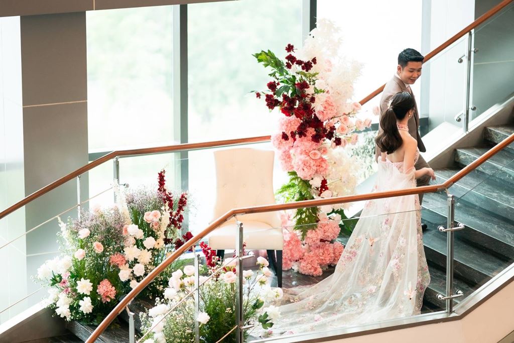 - การตกแต่งดอกไม้ภายในงาน พร้อมฉากหลังโลโก้ที่ออกแบบเฉพาะสำหรับคู่บ่าวสาว