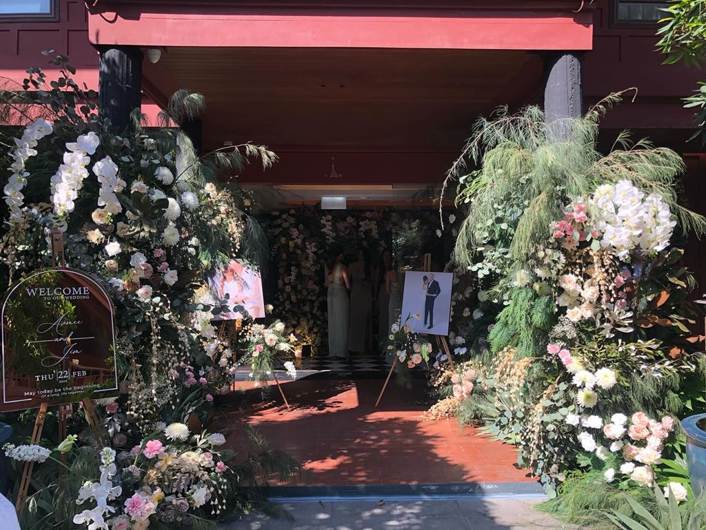 - ตกแต่งฉากถ่ายรูปด้วยดอกไม้เสมือนจริง และป้ายชื่อ