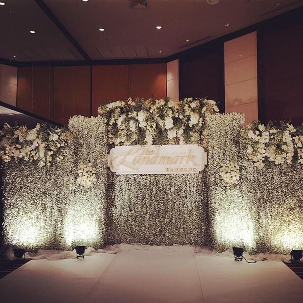 - ตกแต่งเวทีด้วยดอกไม้เสมือนจริงผสมดอกไม้สด และป้ายชื่อ