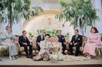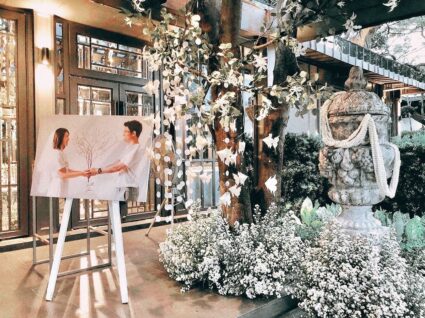 - ตกแต่งฉากถ่ายรูปด้วยดอกไม้เสมือนจริง และป้ายชื่อ