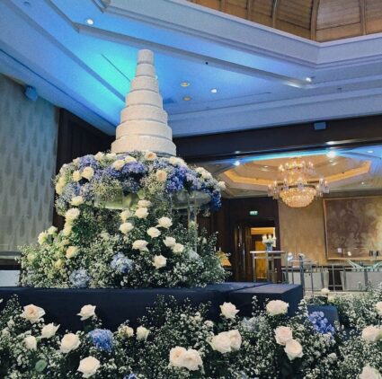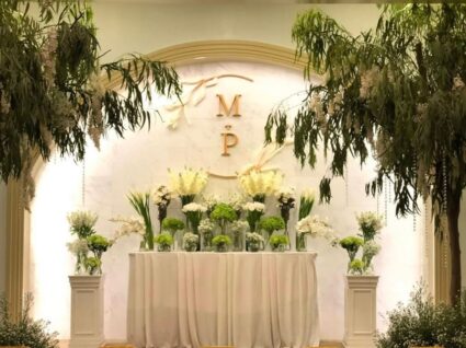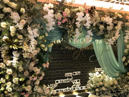 - ตกแต่งเวทีด้วยดอกไม้เสมือนจริงผสมดอกไม้สด และป้ายชื่อ