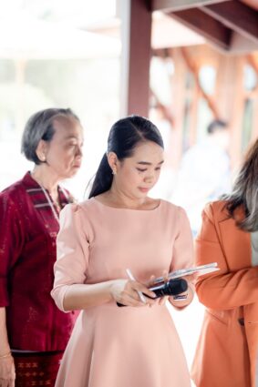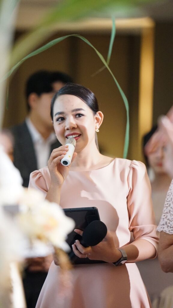 พิธีกรงานแต่งงาน งานหมั้น งานเลี้ยงฉลอง พิธีกรยิ้มเก่งและเป็นกันเอง ใส่ใจรายละเอียด เน้นความสุขของทุกคนในงาน ดูแลเหมือนคนในครอบครัว พร้อมให้คำแนะนำสำหรับบ่าวสาว