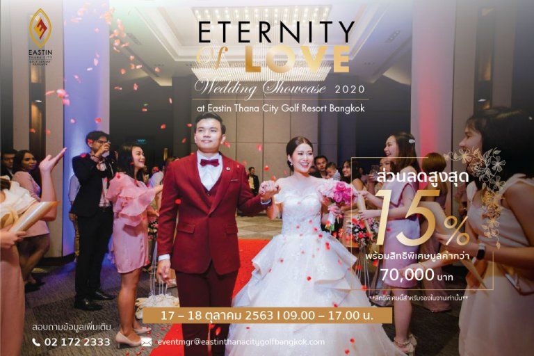หลีกหนีความวุ่นวายมาจัดงานวิวาห์ในบรรยากาศรีสอร์ทสุดร่มรื่น ที่ Eastin Thana City Golf Resort Bangkok ไม่ว่าจะเป็นงานในสวนสวย หรือในห้องบอลรูมโอ่โถง ที่นี่พร้อมมอบความสุขและความผ่อนคลายให้แก่คู่บ่าวสาวและแขกทุกคน