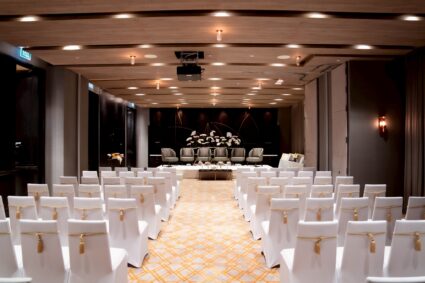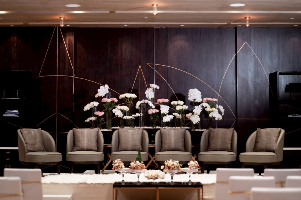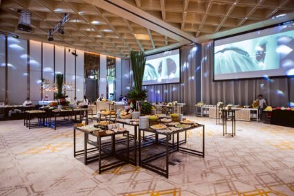 - Regency Ballroom: ห้องจัดเลี้ยงหลักขนาดใหญ่ที่ตกแต่งสไตล์ Contemporary Luxury เพดานสูง โปร่งโล่ง ไม่มีเสากั้น (Pillarless) พร้อมจอ LED ขนาดใหญ่และระบบแสงสีเสียงล้ำสมัย รองรับการจัดงานได้หลากหลายธีม