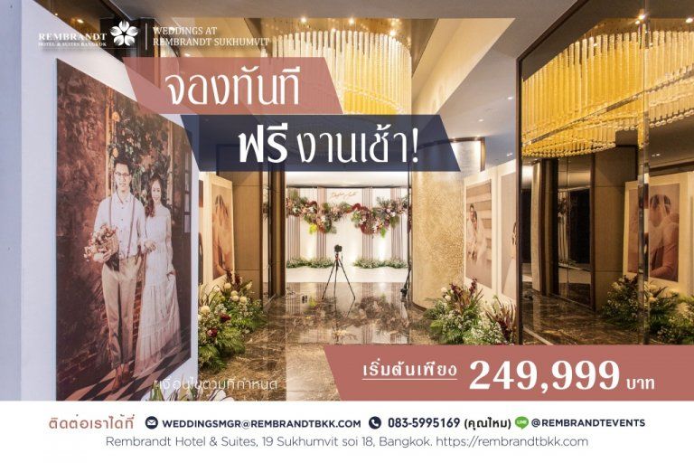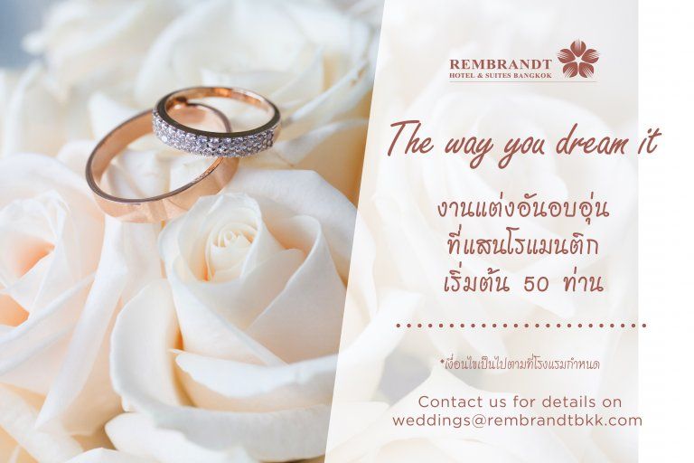 สำหรับคู่รักที่หลงใหลในมนต์เสน่ห์ของความคลาสสิก Rembrandt Hotel Bangkok คือสถานที่จัดงานแต่งที่อบอวลไปด้วยบรรยากาศอบอุ่นและสง่างามใจกลางสุขุมวิท พร้อมเนรมิตงานวิวาห์ของคุณให้เป็นวันที่น่าจดจำด้วยบริการที่เป็นเลิศและเปี่ยมด้วยประสบการณ์